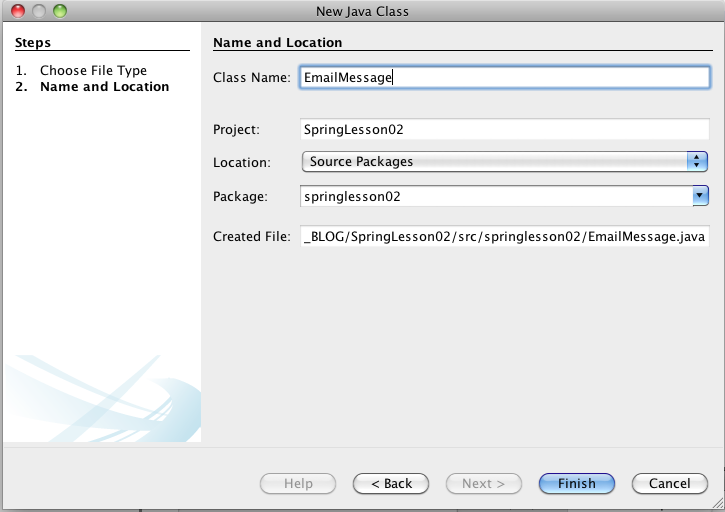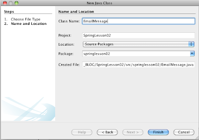 package springlesson02; public class EmailMessage { private String contents; private Sender from; /** * @return the contents */ public String getContents() { return contents; } /** * @param contents the contents to set */ public void setContents(String contents) { this.contents = contents; } /** * @return the from */ public Sender getFrom() { return from; } /** * @param from the from to set */ public void setFrom(Sender from) { this.from = from; } }III) e precisamos que essa classe implemente a interface Message. Para isso adicione o texto implements Message após o nome da Classe. Veja que o NB reclamou.