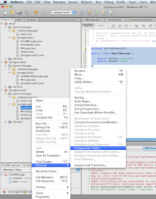package springlesson02; public class EmailMessage { public String contents; public Sender from; }II) Clique com botão direito neste arquivo EmailMessage.java e escolha a opção Refactor >> Encapsulate fields
